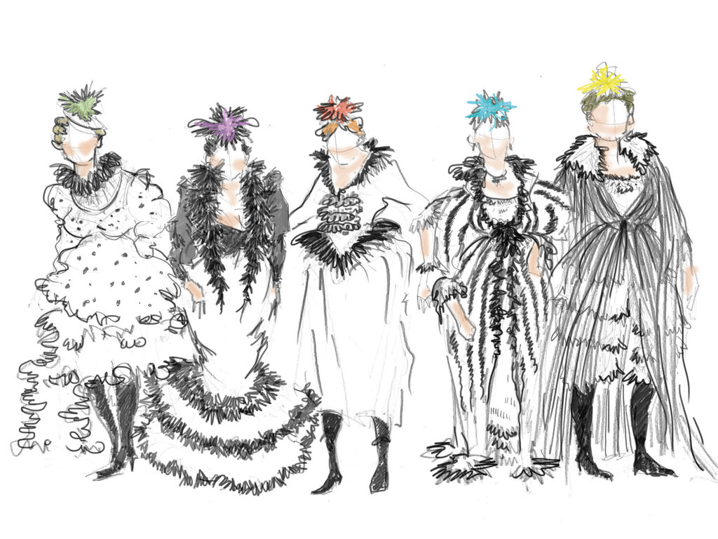 Aber ich gehe nicht ins Detail und schreibe zum Beispiel den genauen Stoff vor oder bestimmte Schnittmuster und Nähtechniken. Das wurde in meinem Studium auch gar nicht gelehrt. Dafür dienen mir die bildlichen Referenzen, von denen ich versuche, so viele und präzise wie möglich zu finden. Für die konkrete Umsetzung stehe ich im Austausch mit der Gewandmeisterin Silke Wille. Es ist eine sehr enge Zusammenarbeit mit den Kolleginnen und Kollegen der Kostümabteilung, die die Referenzbilder und die Zeichnungen, die eigentlich nur ein farbiger Energieschwall sind, zusammenbringen müssen. Ihr Können gibt uns die Möglichkeit, es so umzusetzen, dass es funktioniert wie gedacht.